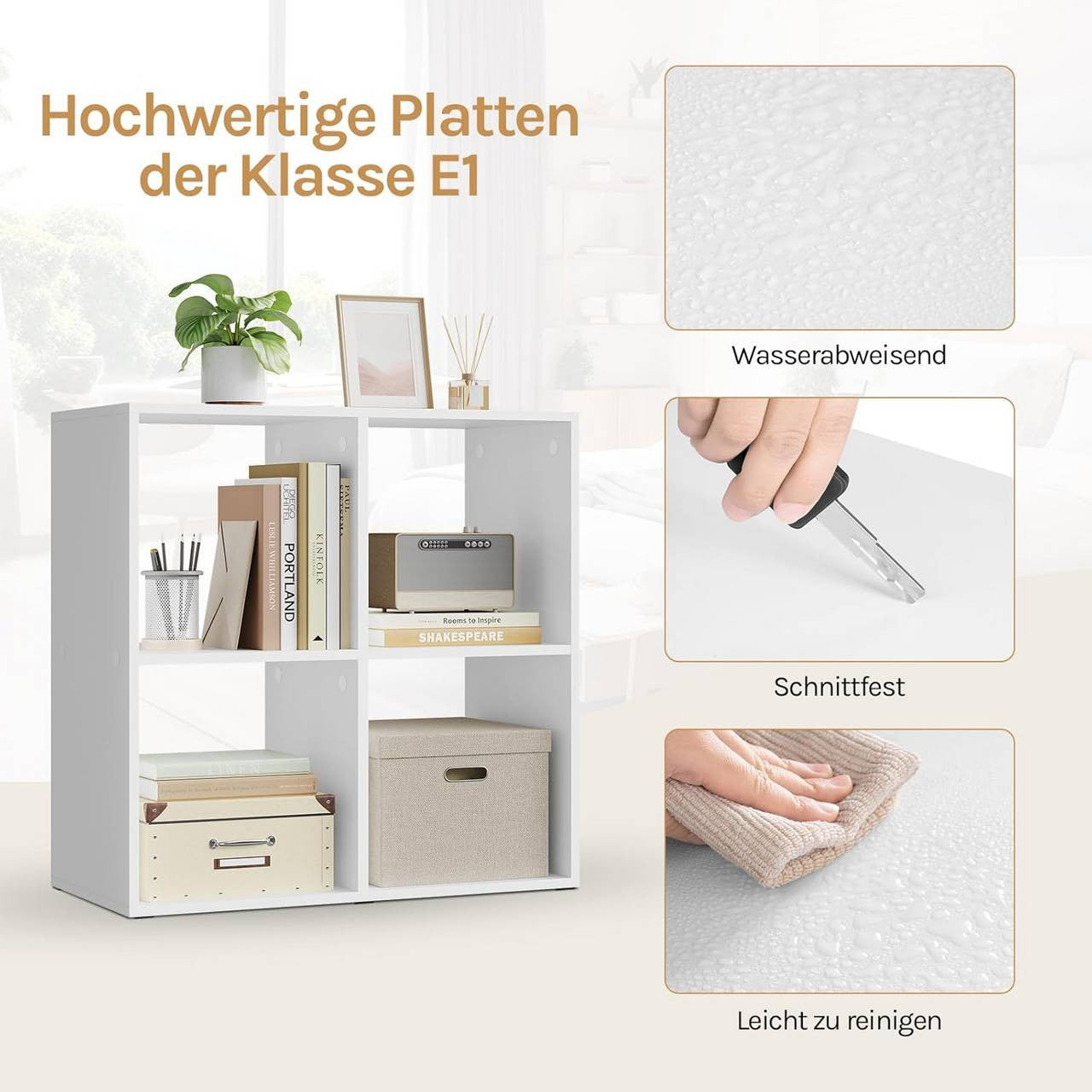 - Robust and Safe: Made from E1 grade wood with a melamine veneer, the open bookshelf is durable, water-resistant, scratch-resistant, and easy to clean.