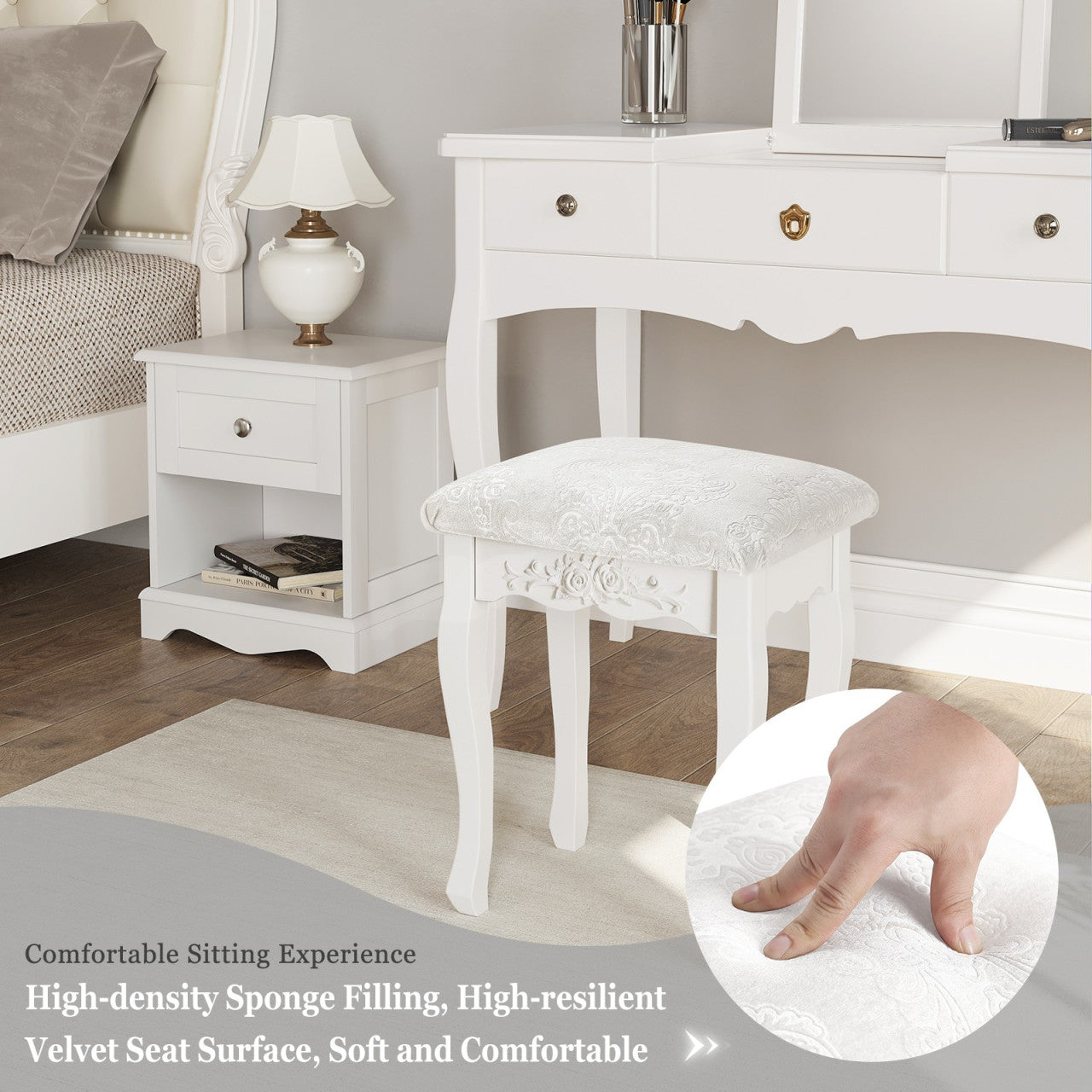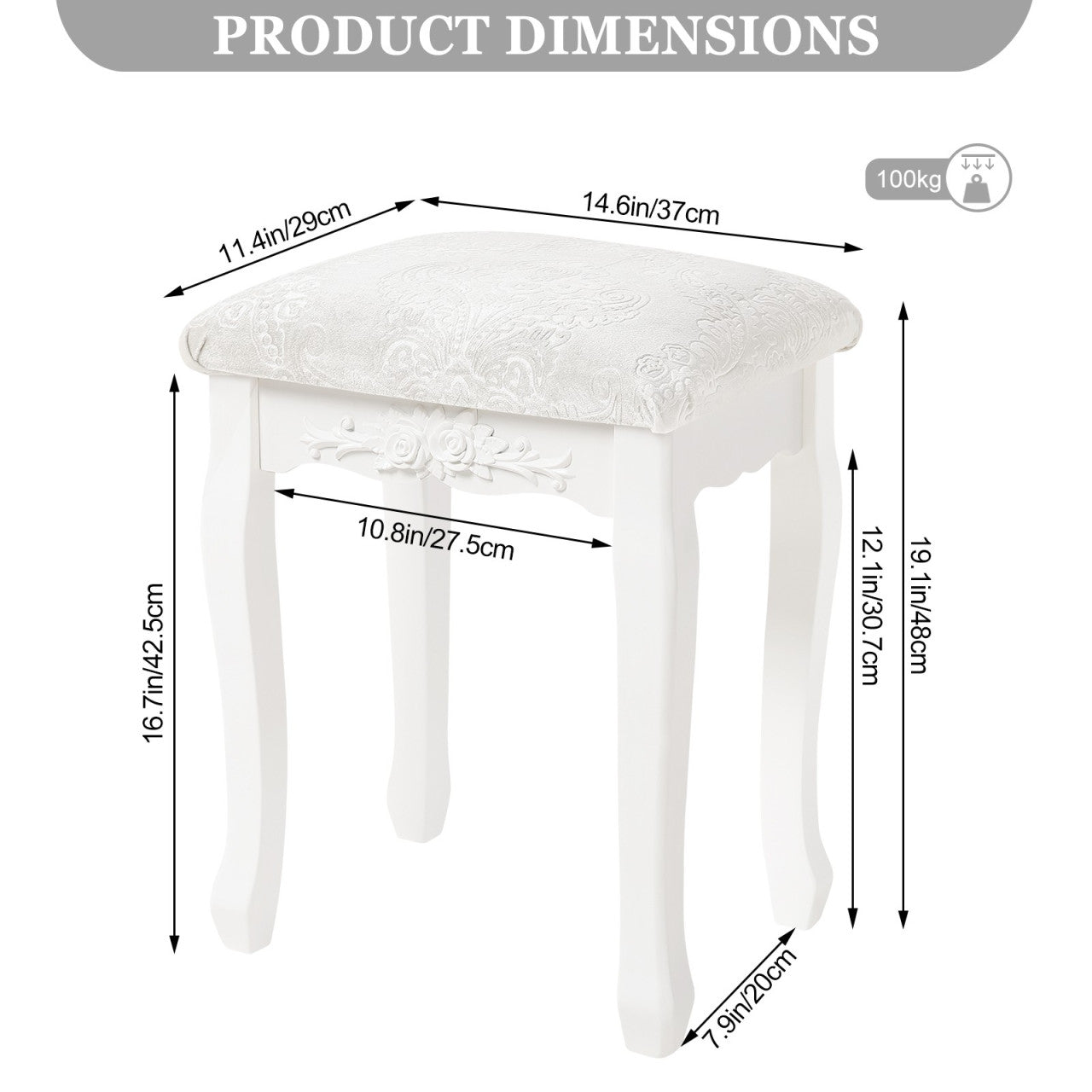 - Gevoerde zitting: de zitting van de kruk is opgevuld met schuim met hoge dichtheid, zacht en comfortabel. Je kunt er lang op zitten om je make-up of kapsel te doen, en je zult je daarna niet te moe voelen