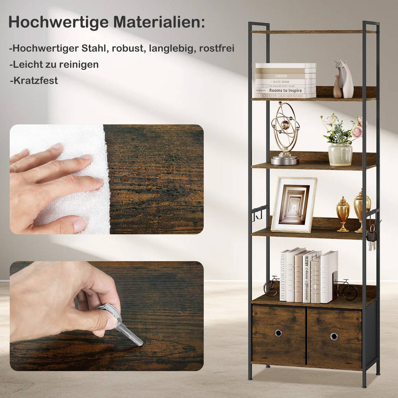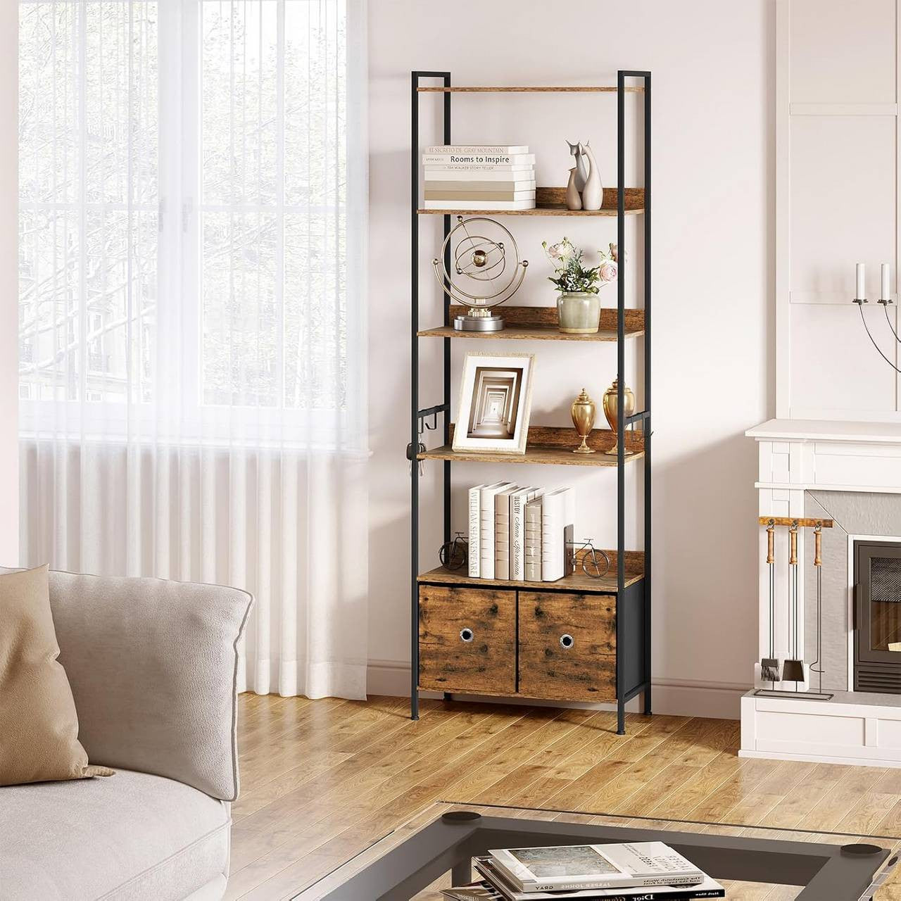 - Spacious Storage: 5 open shelves for books, photo frames, plants, and your favorite figurines, along with 2 fabric drawers for documents or personal items, plus 4 metal hooks for hanging jackets, hats, bags, and scarves - the standing shelf is the ideal storage solution for a well-organized home.